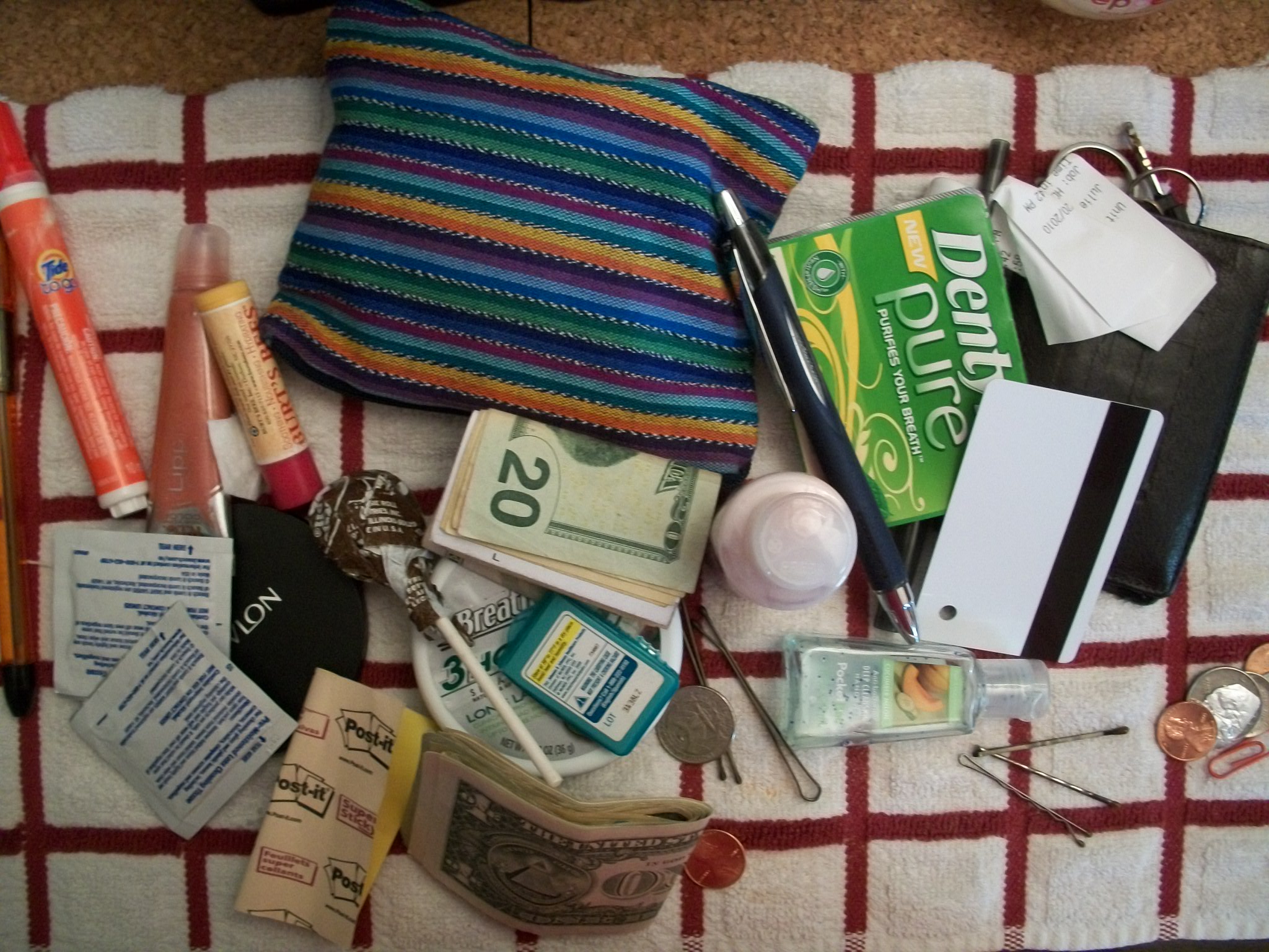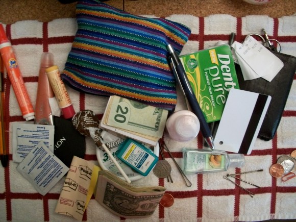 3. I’m usually good for having at least one random item in my purse: a spoon, perhaps. Or maybe some Mardi Gras beads. This picture is disappointingly mundane. These are all items that anyone could have in their purse. Lip gloss? Lotion? Pens? Ho-hum. Sorry, folks.