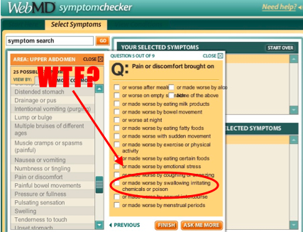 Thanks, WebMD, for reminding me that the Ajax I had for breakfast just might be the cause of my intense abdominal discomfort and / or death-like symptoms.